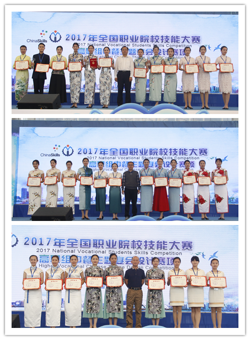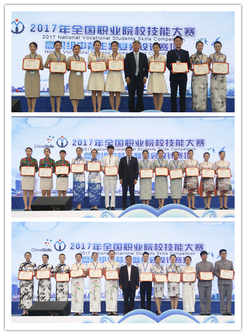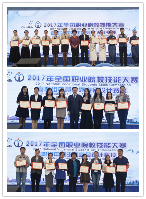 闭幕式上,大赛裁判长王美萍宣布比赛成绩,与会领导和嘉宾为获奖代表颁奖。本次大赛设参赛代表队团体奖,经过三天的激烈比拼,最终437bwin必赢国际官网、山东旅游职业学院等8个院校荣获一等奖,浙江商业职业技术学院、重庆城市管理职业学院等17个院校荣获二等奖,大连职业技术学院、太原旅游职业学院等25个院校荣获三等奖,许文素、郭贵荣等16位指导教师荣获优秀指导教师奖。