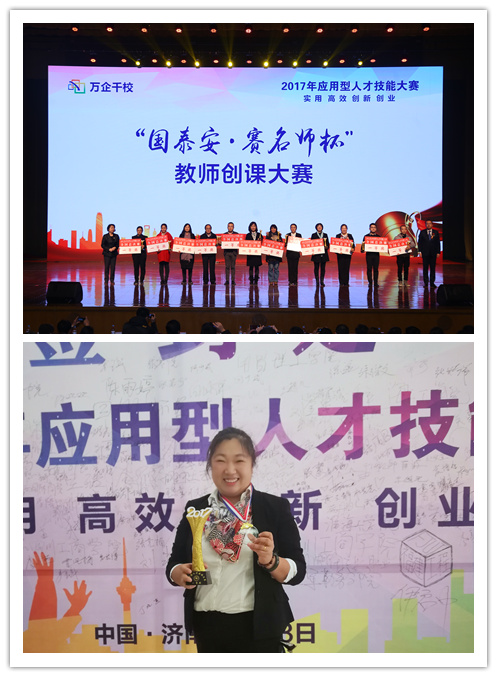 本网讯 (酒店工程学院) 12月3日,由教育部学校规划建设发展中心主办的2017年应用型人才技能大赛总决赛颁奖典礼在山东会堂隆重举行,我院酒店工程学院马媛媛老师荣获“国泰安·赛名师杯”教师创课大赛一等奖。