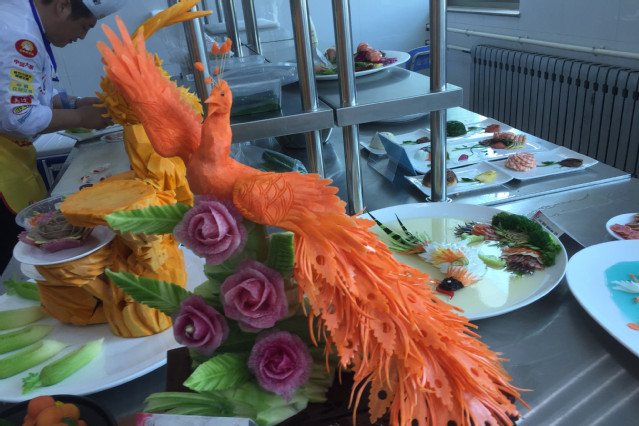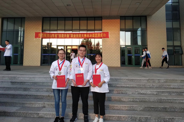 山东省“技能兴鲁”职业技能大赛暨第五届全省餐饮行业职业技能竞赛是高级别职业技能赛事,丁德龙和三名同学在鲁东赛区选拔赛中脱颖而出,从而参加了此次总决赛。大赛分为中式烹调和中式面点两个竞赛项目,来自五个分赛区的200余名选手登上了此次总决赛的擂台。为更全面的评价选手的技能水平,本次赛事采用现场操作表现评分和作品评分相结合的方式,两项成绩相加为选手的最终成绩。最终,丁德龙老师在比赛中稳定发挥,沉着应对,以热菜牡丹虾球,雕刻孔雀迎宾获得中式烹调组金牌。中西面点专业学生胡燕飞、李晓梦获得金牌,崔娇艳同学获得银牌。