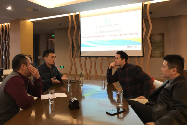 本网讯(基础部 闫晓磊)11月8日,基础部旅游英语教研室组织本学期在学院工作的外籍教师开展本学期的教学经验分享会。基础部主任董瑞虎,学院外籍教师Bruno,Alberto和Enyel以及旅游英语教研室全体教师参加了此次活动。