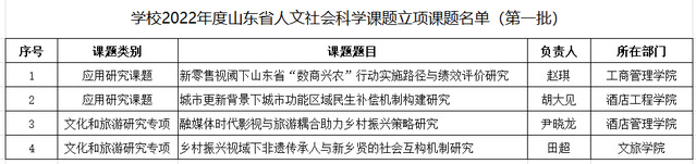 本网讯(科研发展处)近日,山东省人文社会科学课题管理办公室公布了2022年度山东省人文社会科学课题第一批立项课题名单。必赢官网赵琪教授主持的“新零售视阈下山东省‘数商兴农’行动实施路径与绩效评价研究”、胡大见副教授主持的“城市更新背景下城市功能区域民生补偿机制构建研究”、尹晓龙博士主持的“融媒体时代影视与旅游耦合助力乡村振兴策略研究”、田超副教授主持的“乡村振兴视域下非遗传承人与新乡贤的社会互构机制研究”喜获立项。