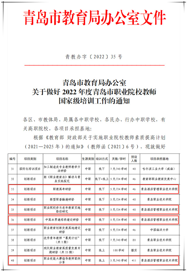 按项目成立申报团队,整合学校培训资源,将学校的办学特色和专业优势与项目的培训目标和培训定位精准匹配,开展培训调研与诊断,围绕师德师风、职教理论、改革理念、路径实施、企业实践、案例教学、交流互鉴等模块开发设计培训方案。全校申报青岛市2022年国培项目22项,中标11项,申报项目数、中标项目数、培训人数均创下历年新高。