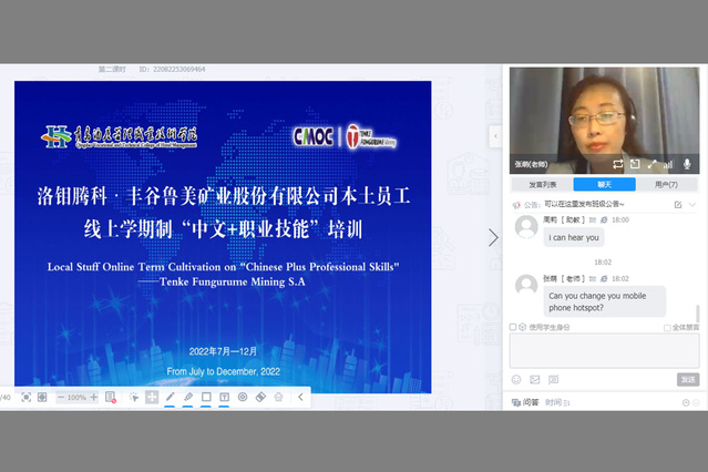 本网讯(国际交流与合作处 张晴)8月23日,在有色金属工业人才中心支持下,学校与洛钼腾科·丰谷鲁美矿业股份有限公司联合举办了线上学期制“中文+职业技能”培训项目第一次线上直播课程。