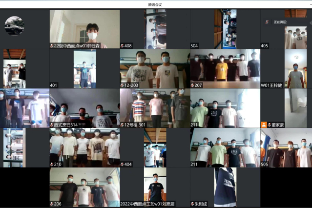 烹饪学院聚焦增强新生国防意识、激发新生爱国情怀,开展了系列别开生面的“云军训”活动。退役军人大学生志愿消防队发挥朋辈力量、化整为零,深入学生楼宇开展宿舍内务指导、国防知识普及、军训动作训练、防诈骗知识宣讲、心理健康教育等。通过“云军训”,将线上教学与国防军事素养教育、爱国主义思政教育有效结合,引导新生以崭新的精神风貌、健康强健的体魄、积极阳光的生活态度开启大学生活的美妙旅程。