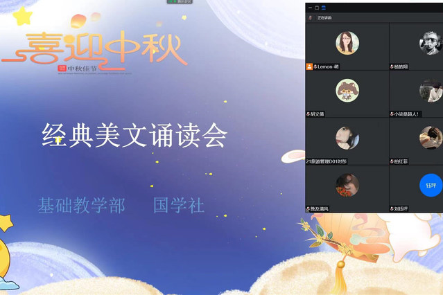 在东餐厅门口,身穿汉服的国学社学生为师生们准备了各式各样的月饼,让老师和异乡求学的学子们感受节日的气氛,领略中华传统美食的魅力。此外,基础教学部围绕“中秋特色”,突出文化主题,组织学生线上开展了经典美文诵读会、诗词赏析讲座等系列活动,借助“互联网+”,让中秋节变得更有“味道”,极大地点燃了学生对传统文化的热情。