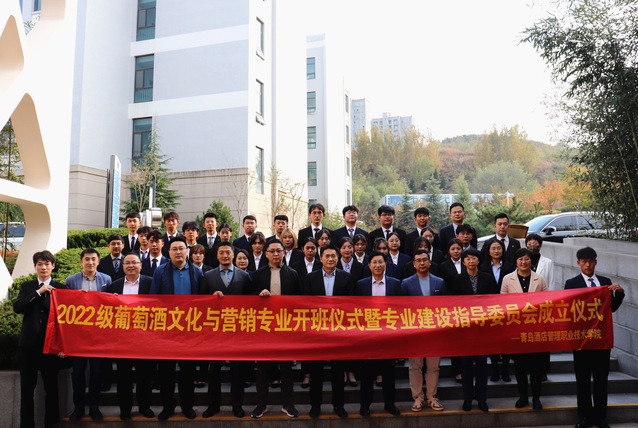 光环控股集团董事局主席、酩悦世界美酒中心CEO艾逸飞,法国CAFA葡萄酒烈酒学院山东校区校长郄帅才,青岛品醇汇咨询管理有限公司CEO王慧林,青岛铭家餐饮集团酒水总监敬树森,上海旅游高等专科学校葡萄酒文化与营销专业负责人陈思、青酒管品酒师与侍酒师校友会成员,酒店管理学院负责人、教师代表、2022级葡萄酒文化与营销专业全体学生参加仪式。