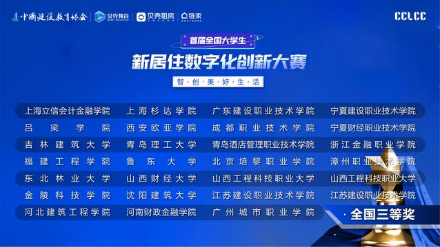 首届全国大学生新居住数字化创新大赛由中国建设教育协会联合贝壳共同举办。大赛共有来自全国70多个城市和地区110所高校的近700支队伍参加,报名学生超过3000人。必赢官网派出的3支队伍分别获得全国一等奖、智慧创新一等奖、全国三等奖,学校被评为优秀组织高校。