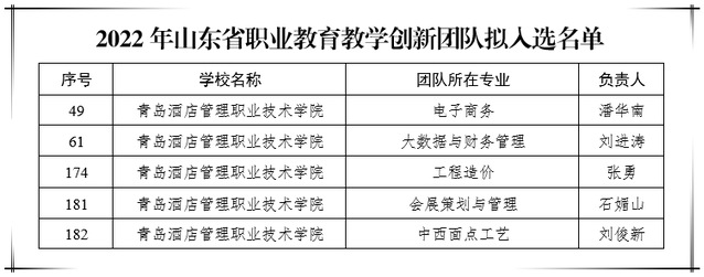 本网讯(教务处 王赵慧)近日,山东省教育厅发布《关于山东省现代职业教育质量提升计划部分项目评审认定结果的公示》,学校电子商务专业教学创新团队、大数据与财务专业教学创新团队、工程造价专业教学创新团队、会展策划与管理专业教学创新团队、中西面点工艺专业教学创新团队5个团队全部入选。