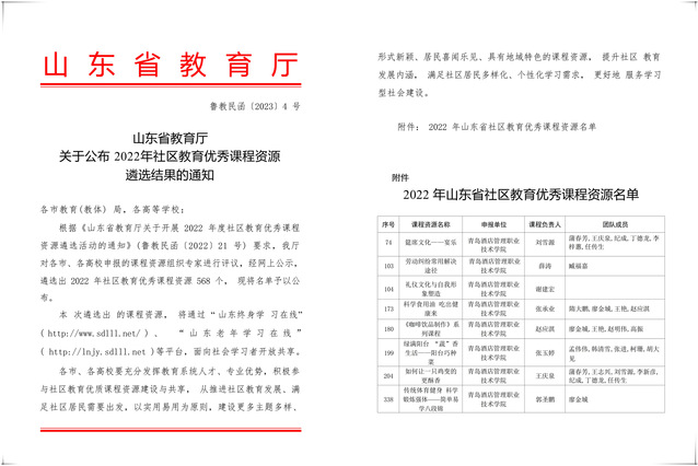 本网讯(继续教育学院)近日,山东省教育厅公布了2022年社区教育优秀课程资源遴选结果,必赢官网8门课程入选,入选数量位于全省前列。