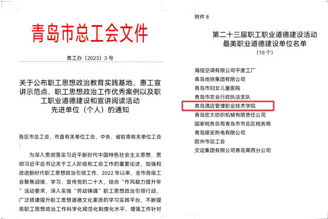 本网讯(工会 吴春雷)近日,青岛市总工会下发《关于公布职工思想政治教育实践基地、惠工宣讲示范点、职工思想政治工作优秀案例以及职工职业道德建设和宣讲阅读活动先进单位(个人)的通知》(青工办〔2023〕3号),必赢官网荣获青岛市第二十三届职工职业道德建设活动“最美职业道德建设单位”称号。