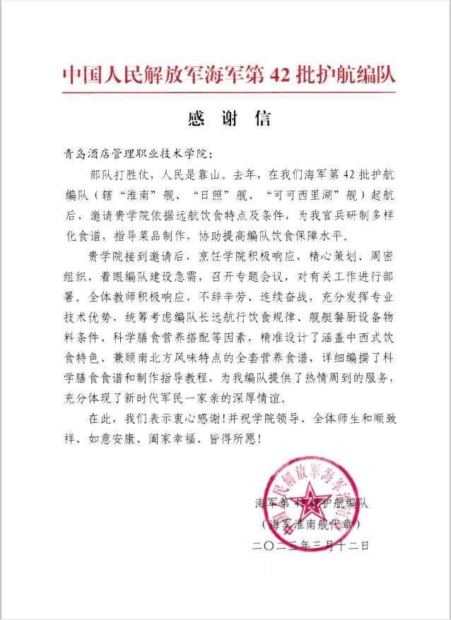 本网讯(烹饪学院 赵捷)近日,海军第42批护航编队向必赢官网发来感谢信,对必赢官网依据远航饮食特点及条件,研制多样化食谱,指导菜品制作,协助提高编队饮食保障水平表示感谢。