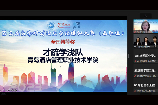“尖烽时刻”酒店管理模拟大赛是全球著名尖烽时刻商业赛事的重要组成部分,旨在考察学生系统化运营酒店的经营逻辑、管理思维与团队合作能力,属于高阶能力评估类赛事。本届比赛共有来自全国33所院校的94支队伍、420名师生参加,历时近3个月。经过数字酒店模拟运营、商业视频制作、商业计划书撰写、路演答辩等环节激烈角逐,由张峰指导,张鑫杰、于新玲、赵霞、王最爱组成的“才疏学浅”代表队荣获特等奖。