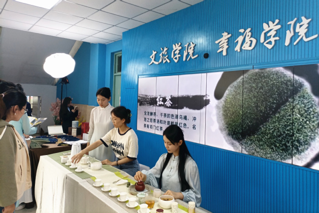 文旅雅集活动借鉴雅集活动特点,以专业群实践教学体系活动为载体,统筹旅游管理、会展策划与管理、研学旅行管理与服务、文化创意与策划等专业技能和资源优势,设置品茗、闻香、研学、拓染、书法等互动项目。学生凭借平时所学知识,相互切磋,各显本领,展示了茶艺、咖啡、非遗古法拓染研学、非遗香薰研学、非遗鸟虫篆文创产品策划等专业技能,用实践活动展现专业内涵,助力推动幸福产业发展。各版块学生团队现场的专业讲解和娴熟展示得到众多师生的广泛好评。