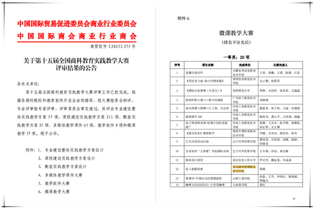在全国高校商业精英挑战赛中,会计学院赵馨怡、齐庆馨、贾文婷、韩世豪4名学生组成的“寻找蓝海的‘鲨鱼’队”荣获高职组全国一等奖。在全国商科教育实践教学大赛中,刘凯老师的“基于实践教学平台的‘税务会计’课程实践教学方案设计”获课程建设实践教学方案设计二等奖,徐凯、赵颖慧老师的“证券投资实务课程实训工作手册”获配套实践教学方案设计三等奖,李楠、刘凯、王萍老师的“出纳业务操作”及李新彦老师的“预算与绩效管理”分别获多媒体教学课件大赛一等奖和三等奖,黄媛老师的“收入数据洞察”及丁冰、赵颖慧老师的“机动车辆保险业务处理”分别获微课教学大赛一等奖和三等奖。在全国商科教育科研课题大赛中,李真老师的《数智化背景下高职院校财会智慧学习工场的构建研究》及沙珍珍老师的《乡村振兴视域下商科类专业创新创业人才培养路径研究》获论文类二等奖,黄媛、魏源、薛涛、李新彦老师的“酒店财务现代学徒制试点项目教学案例”及鞠维欣、高琳、苗小爱老师的“大数据应用基础——基于Python金融企业实战案例”获教学案例类三等奖,王萍、李新彦、黄媛、李楠老师的《三教改革背景下企业与高职院校教师互聘机制构建研究》获论文类三等奖。