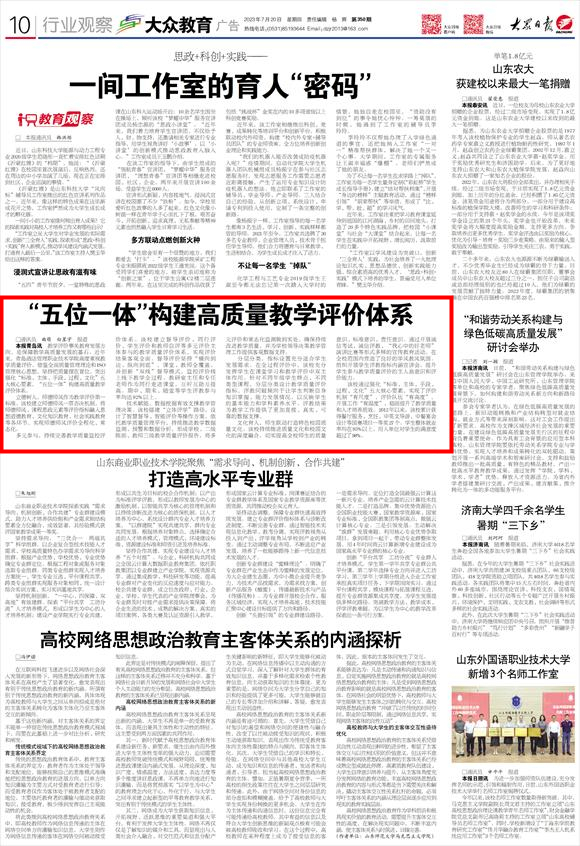 本网讯(党委宣传统战部)7月20日,《大众日报》第10版以《“五位一体”构建高质量教学评价体系》为题,报道学校借鉴全面质量管理理论和ISO管理核心思想,坚持把质量摆在首位,突出强化“标准、主体、手段、过程、文化”五大核心要素,“五位一体”构建高质量教学评价体系。全文如下: