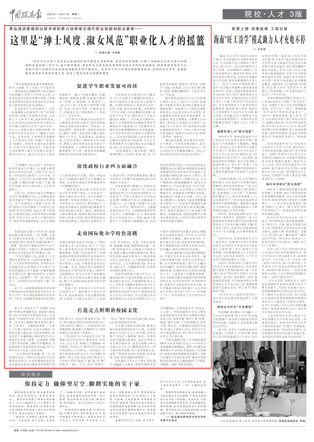 学院还编辑出版了文化建设成果《微笑文化读本》《文以化人——学院文化品牌建设案例集》。微笑文化建设成果荣获山东省高校思想政治工作创新奖、青岛市高校思想政治创新奖。学院文化建设工作也为旅游类、服务类高等职业院校校园文化建设提供了可复制、可借鉴、可推广的典型经验。(本报记者 王诗培)