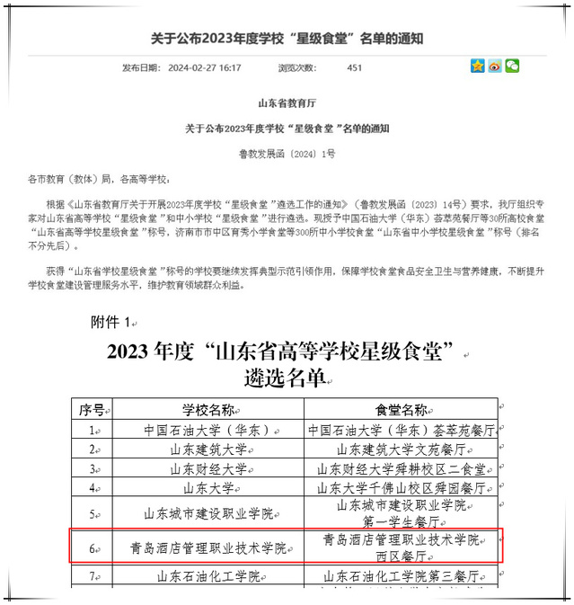 本网讯(总务处 侯鹏)近日,山东省教育厅下发了《关于公布2023年度学校“星级食堂”名单的通知》(鲁教发展函〔2024〕1号),学校西区餐厅被授予“山东省高等学校星级食堂”称号,在30所入选高校食堂中位列第6位。