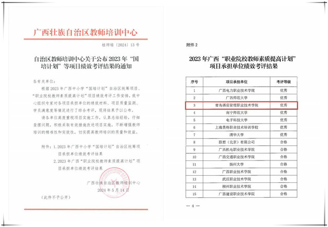 本网讯(继续教育学院)近日,广西壮族自治区教师培训中心公布了2023年“国培计划”等项目绩效考评结果,必赢官网在“职业院校教师素质提高计划”33个承担单位绩效考评中位列第3名,获得优秀等级。