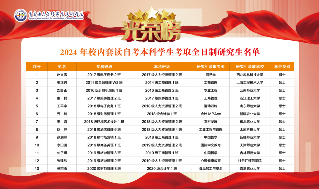 活动现场,继续教育学院表彰了2024年考取研究生的13名校内套读自考本科学生,并为其颁发研究生奖学金。西北农林科技大学博士研究生赵文雪、山东师范大学硕士研究生王平宇、吉林师范大学硕士研究生刘子琪、浙江理工大学硕士研究生董磊四位优秀校友作了求学经验专题汇报。他们回忆了大学生活的点点滴滴,重温了校内套读自考本科的学习经历,分享了准备考研并成功上岸的心路历程,表达了对母校搭建学历提升平台和培育之恩的感谢。榜样的力量感染着现场每一位同学,大家热情高涨,积极与四位校友展开交流。