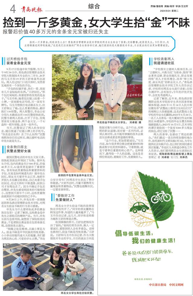 两名女大学生拾金不昧的故事很快在学校传开了。“同学的朋友圈都在转发这件事,知道的人越来越多了。”马玉丹告诉记者,这几天,同学和老师都为她和王舒的事迹点赞。