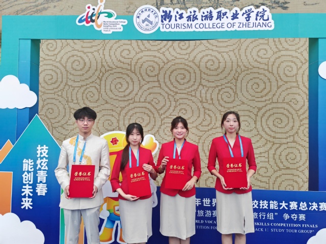 10月24日-26日,2024年世界职业院校技能大赛总决赛“旅游赛道一研学旅行组”争夺赛在浙江杭州举办,437bwin必赢国际官网由武晓凡、杨紫涵、王惠敏、魏英华4名同学组成的参赛队以小组第一名、全国第二名的成绩获得金奖。