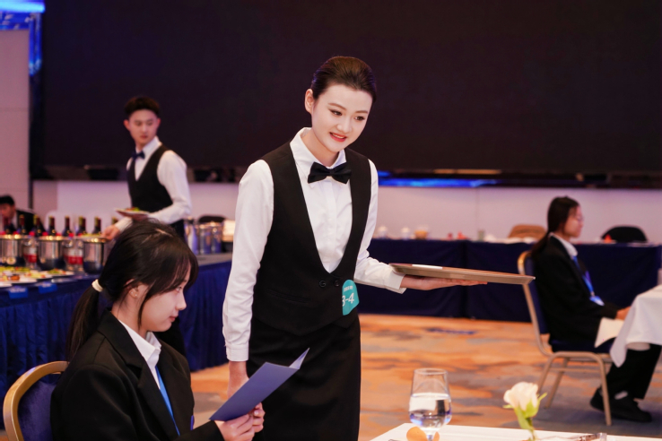 本赛项为团体赛,每队由3名选手组成,共分为前厅接待、中餐服务和西餐服务三个模块。其中前厅接待为办理入住、退房离店;中餐服务为主题宴会设计、宴会服务;西餐服务为休闲餐厅服务。赛项内容涵盖旅游大类酒店管理与数字化运营专业的核心技能和相关岗位职业素养,反映了现代酒店工作的个性化服务、数字化发展、国际化趋势的特点,体现了酒店工作过程的规范化、实境化、流程化、个性化与职业化要求。