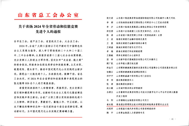 本网讯(工会 吴春雷)近日,山东省总工会下发《关于表扬2024年全省劳动和技能竞赛先进个人的通报》,国际邮轮乘务管理专业教师崔永聪获得“先进个人”荣誉称号;青岛市总工会下发《关于公布2024年青岛市“匠心杯”新就业形态劳动者技能竞赛获奖名单的通知》,学校获得“突出贡献奖”,现代物流管理专业教师贺培青获得“优秀组织个人”荣誉称号。