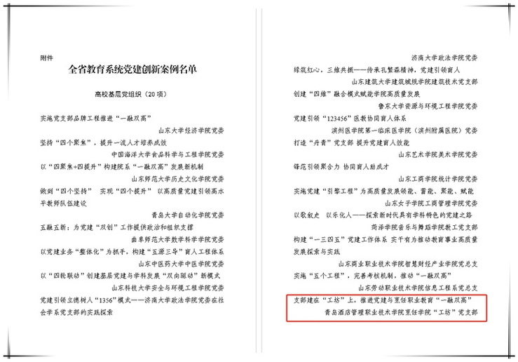 本网讯(烹饪学院 吴琼)近日,省教育厅公布了全省教育系统党建创新案例遴选结果,烹饪学院党总支“工坊”党支部报送的案例《支部建在“工坊”上,推进党建与烹饪职业教育“一融双高”》入选。