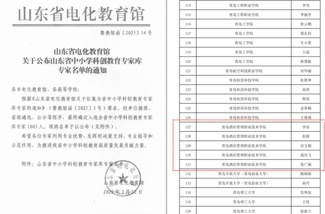 本网讯(教育信息中心 江珊)3月12日,山东省电化教育馆发布了《关于公布山东省中小学科创教育专家库专家名单的通知》(鲁教馆函〔2025〕14号),必赢官网朱广丽、衣文娟、李显、彭霞、战肖飞5位教师入选。