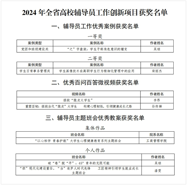 本网讯(学生工作处 朱龙)近日,省委教育工委发布了《关于公布2024年全省高校辅导员工作创新项目评选结果的通知》,学校喜获7个奖项,其中辅导员工作优秀案例一等奖1项、二等奖1项,优秀百问百答微视频2项,辅导员主题班会优秀教案集体作品奖1项、个人作品奖2项,获奖项目质、量双双实现新突破。