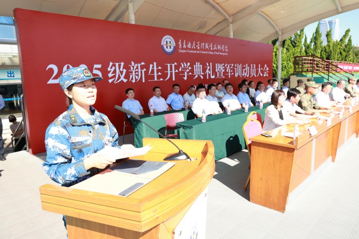 校长姜玉鹏作了题为《日有所进 月有所长 终有所成 奋力书写强国有我、挺膺担当的青春篇章》的讲话,代表学校向全体新生表示热烈欢迎,向各位学生家长、老师和军训教官表示衷心感谢。姜玉鹏指出,80年前,在中国人民抗日战争暨世界反法西斯战争胜利之际,学校的前身——私立青岛商科职业学校成立了,经过几代人的不懈努力和矢志追求,学校至今已走过八十载征程,迎来建校80周年。围绕成长与发展,姜玉鹏与新生分享了三点体会:一是“青酒管是一所什么样的大学”,他表示,学校始终坚守以“立德树人、兴教为民”为使命,立足“建设国内一流、国际知名的酒店业全科型专业链”的目标,是一所有大格局、大情怀、大梦想的学校;二是“时代需要大家成为什么样的人”,激励同学们树立与国家同频共振的远大志向,成长为适应时代的复合型人才,坚定走好一步一个脚印的奋斗之路;三是“如何成为一个既不辜负时代也不辜负自己的人”,希望同学们认真规划大学生活,明确目标、保持行动力,加强体育锻炼,确保身心健康。