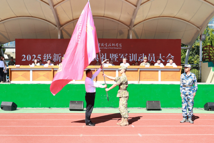 开学典礼暨军训动员大会在庄严的国歌声中开始,并现场举行了授旗仪式,党委书记刁洪斌向新生军训团授团旗,正式拉开了2025级新生军训的序幕。