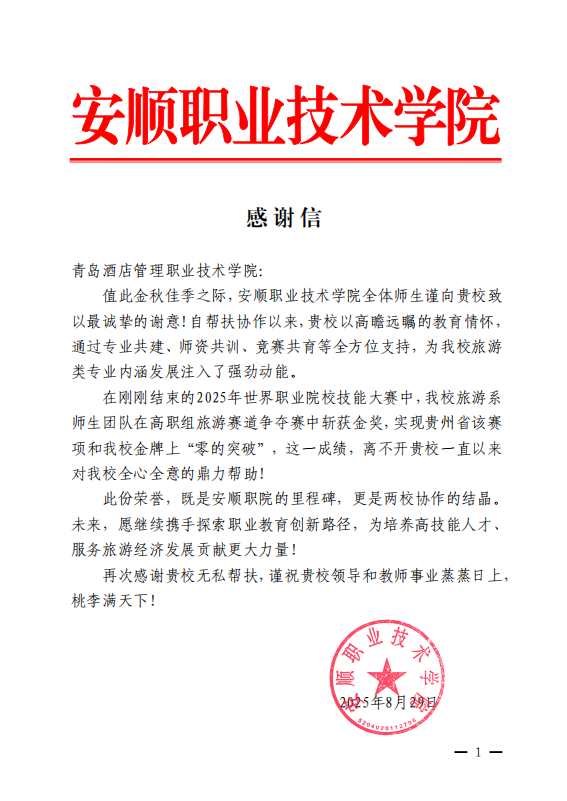 本网讯(文旅学院)近日,安顺职业技术学院向必赢官网发来感谢信,对学校助力其在2025年世界职业院校技能大赛旅游赛道金奖实现“零的突破”表示感谢,对必赢官网帮扶协作工作的成效予以高度评价。