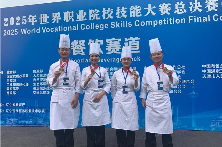本网讯(烹饪学院 赵捷)9月8日至12日,2025年世界职业院校技能大赛争夺赛餐饮赛道高职组比赛在辽宁现代服务职业技术学院举行,学校烹饪学院学生张璐、张佳宁、杨心茹、黄旭组成的参赛团队荣获金奖,刘俊新、王庆泉老师荣获“优秀指导教师”。
