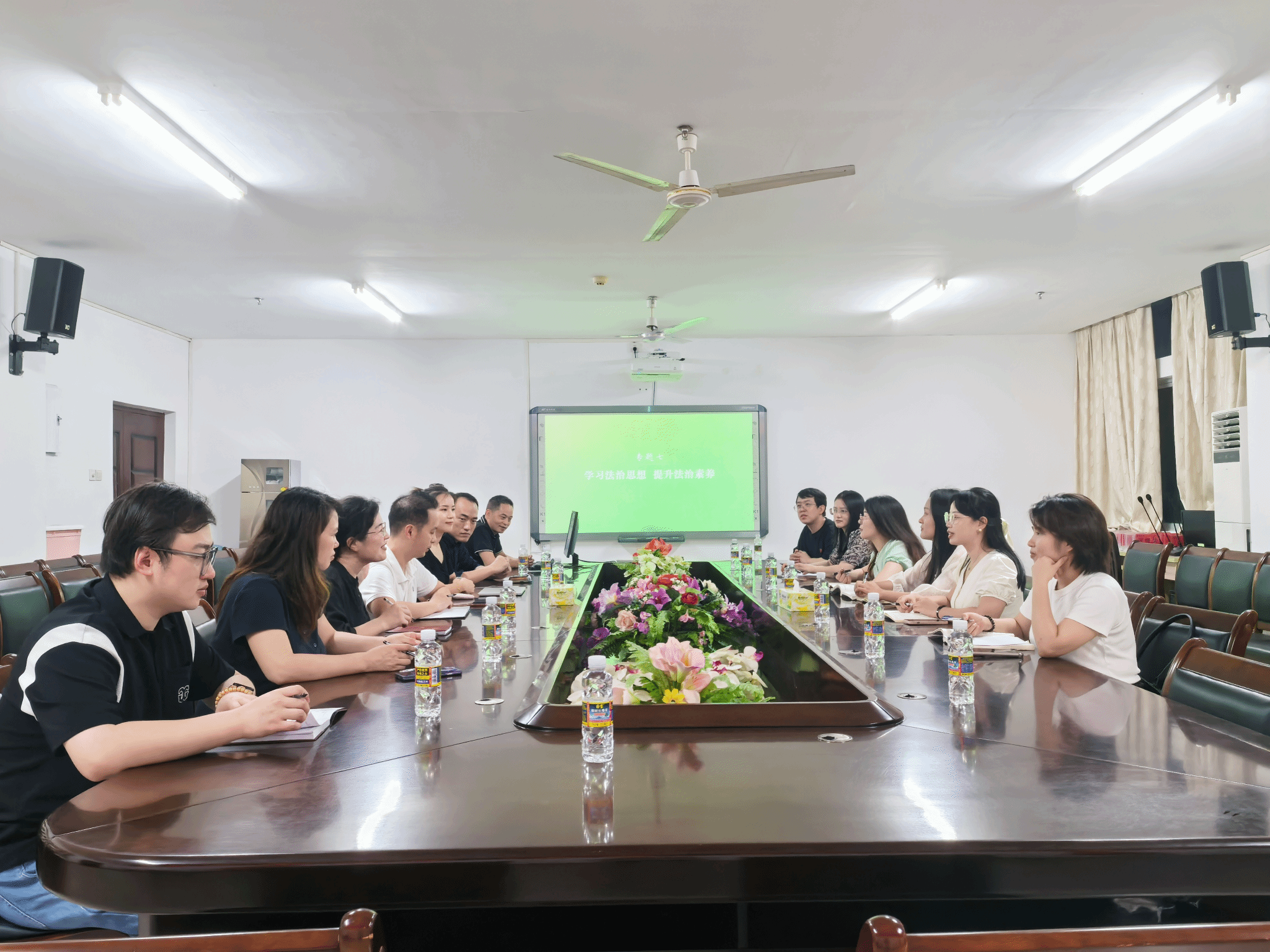 会议第一阶段,主讲人说课。周细波和郑坚铭两位老师介绍了法治部分三个专题的逻辑框架、教学思路、主要内容、教学重难点及在教育部课件基础上所做的修改,并围绕重难点做了详细地讲解。