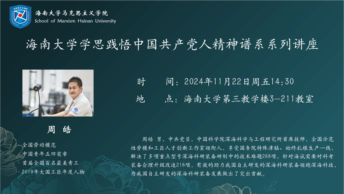 2024年11月22日下午,sunbet申搏官方网站学思践悟中国共产党人精神谱系系列讲座正式开讲。学院邀请了中国科学院深海科学与工程研究所首席技师、2019年大国工匠年度人物周皓为2024级数学与统计学院本科生做专题讲座。周皓以“践行工匠精神 献身深海科考 新征程 再起航”为题,从成长经历、深海科考、工匠精神三方面为同学展开讲授,由凤翔书院郭孝伟老师主持,sunbet申搏官方网站蔡文举副院长参加。
