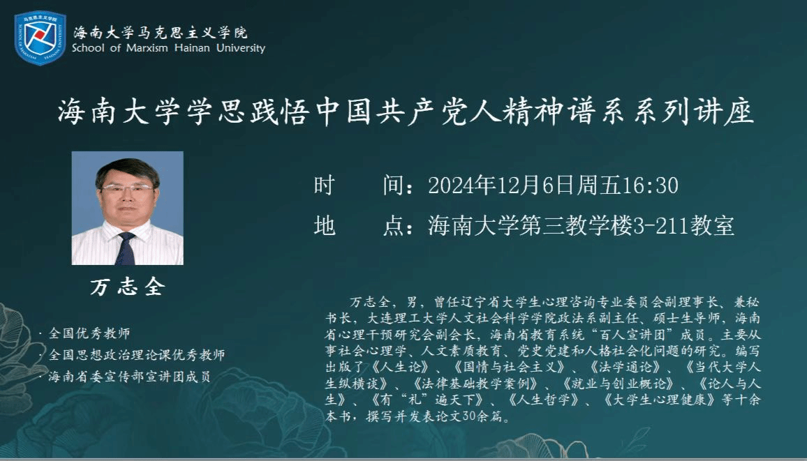 万志全教授首先抛出三个问题,“我们要做什么样的人?什么样的人是大学生?什么样的人是中国人”促使大家思考。人是社会的主体,中国人是其重要组成部分,而海南的发展,海大人是其重要的力量。现代社会经济飞速发展,但是精神却在一定程度上缺失了,万志全教授告诉我们,“任何时候都不能丢掉民族情怀”,作为青年人,我们要结合现在的科技手段,把民族精神充分发挥出来。