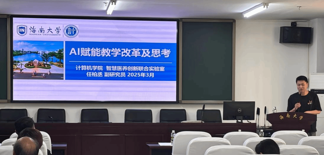 会议第三阶段,举办了《AI赋能教学改革及思考》专题报告,由计算机学院副研究员任柏丞主讲。他聚焦学院的专业特色和思政课教学,从 AI 赋能教学政策、大模型及应用、赋能实施、教学思考等四个板块,深入探讨了 AI 技术在教学领域的应用以及如何通过 AI 技术提升教学效果。