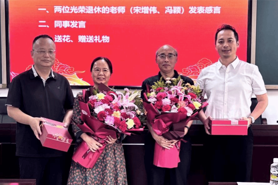 会议第二阶段,举行了宋增伟教授、冯颖教授的荣休仪式。两位教授深情回顾了自己教学经历,表达了对学校和学院的深厚感情,并表示自己将在退休后继续发扬奉献精神,持续关心学院的发展。王大群高度评价了两位教授在教学、科研及学院建设等方面作出的卓越贡献,王善、王一闳向两位荣休教师赠送鲜花和纪念品。
