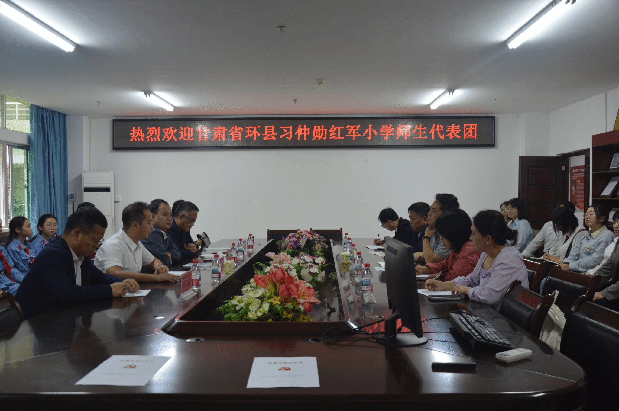 sunbet申搏官方网站副院长蔡文举、王一闳;环县习仲勋红军小学副校长杨志科;双方师生代表参加会议。