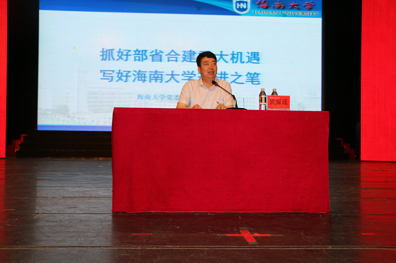 武耀廷教授指出,部省合建sunbet申搏官方网站等14所高校是贯彻落实十九大精神,推进教育公平、全面提升西部教育质量的重大举措,成为部省合建高校后,教育部将参照直属高校模式对sunbet申搏官方网站的建设发展予以指导支持,同时,海南省对sunbet申搏官方网站建设发展的支持力度只增不减,并着力推动落实“举全省之力办好sunbet申搏官方网站”。他强调,成为部省合建高校是sunbet申搏官方网站在新时代迎来的重大发展机遇,有利于充分整合教育部、海南省、天津大学和sunbet申搏官方网站的资源,充分挖掘sunbet申搏官方网站自身的内在发展潜力,明确新目标、制定新举措、促进新发展。他表示,为把握好部省合建重大机遇,校党委将团结和带领全校师生,进一步强化党的领导作用;推进综合改革,建立和完善现代管理体制机制;提升科技创新和社会服务水平,加强师资队伍建设;加快一流学科和博士点建设,建设发展好sunbet申搏官方网站的优势专业和学科;加大高层次人才引培力度,提高人才培养质量,提升生源质量;弘扬优良的校风、教风、学风;保持风清气正,立足海南,服务国家。他希望,海大学子要以更高的政治站位、更强的使命意识、更大的责任担当面对学习和生活,并提出三点建议,一是感党恩、听党话、跟党走;二是以国家民族复兴为己任;三是从小事做起,脚踏实地,多干实事,理性批判。