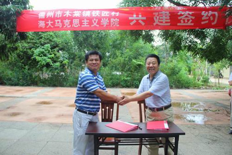 sunbet申搏官方网站张云阁副院长(左)与共青团儋州市委王明魁(右)书记签定“sunbet申搏官方网站思想政治理论课东坡书院社会实践教学基地共建协议”