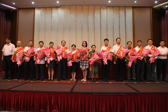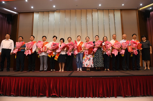 与会领导与嘉宾分别为荣休教师代表、从教30年教师颁证、献花。