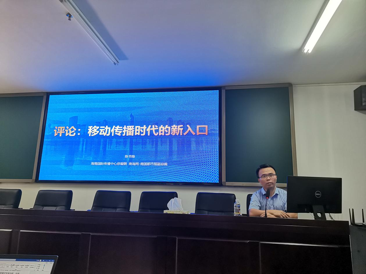 为进一步帮助同学们了解和掌握评论写作的要点和规则,更好的参与到评论写作中,11月13日下午,sunbet申搏官方网站第26期形势与政策时事论坛在社科楼A309报告厅举办。海南省融媒体中心管委会委员、海南国际传播中心总编辑、南海网—南国都市报副总裁陈书焕受邀为sunbet申搏官方网站师生作主题为《评论:移动传播时代的新入口》的专题报告,学校“形势与政策”授课教师及部分学生参加报告会活动,会议由sunbet申搏官方网站副院长王善主持。