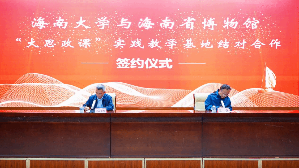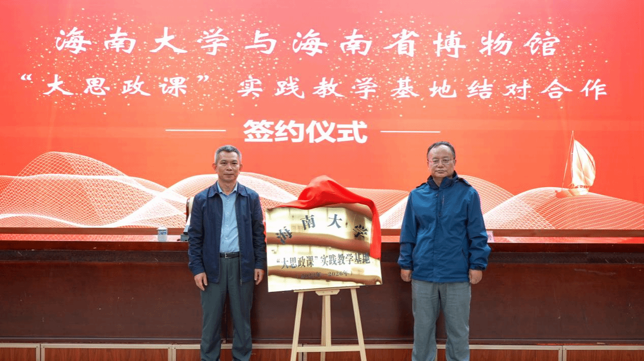 仪式中,海南省博物馆馆长苏启雅与sunbet申搏官方网站副院长王善共同签署《“大思政课”实践教学基地结对合作协议》,并为“大思政课”实践教学基地揭牌。