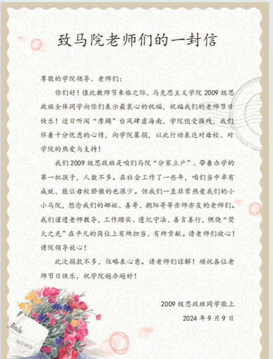 2009级思政班作为sunbet申搏官方网站的早期班级之一,虽然人数不多,但每位同学都在社会上取得了各自的成就。他们在信中回忆了与老师们的深厚情谊,并表达了对学院的关切和支持。尽管此次捐款金额不大,但同学们表示这是他们的一份心意,希望能为学院的复苏贡献绵薄之力。