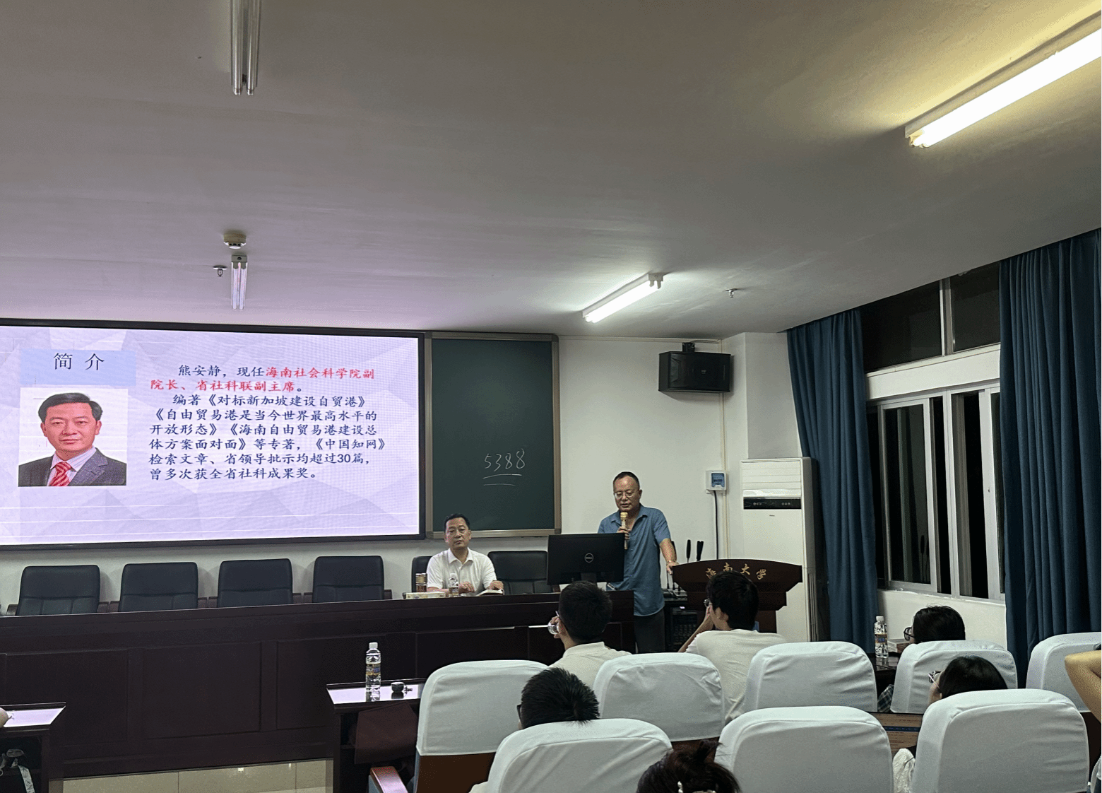 2023年10月23日,sunbet申搏官方网站“冬季小学期系列课程”第五讲在社科楼A309会议室举⾏。海南社科联副主席熊安静以“海南自由贸易港试点政策进展与封关运作展望”为题,为sunbet申搏官方网站师生做了一场生动的报告。报告会由王善副院长主持,sunbet申搏官方网站本科生、研究生以及博士生聆听了此次学术报告。