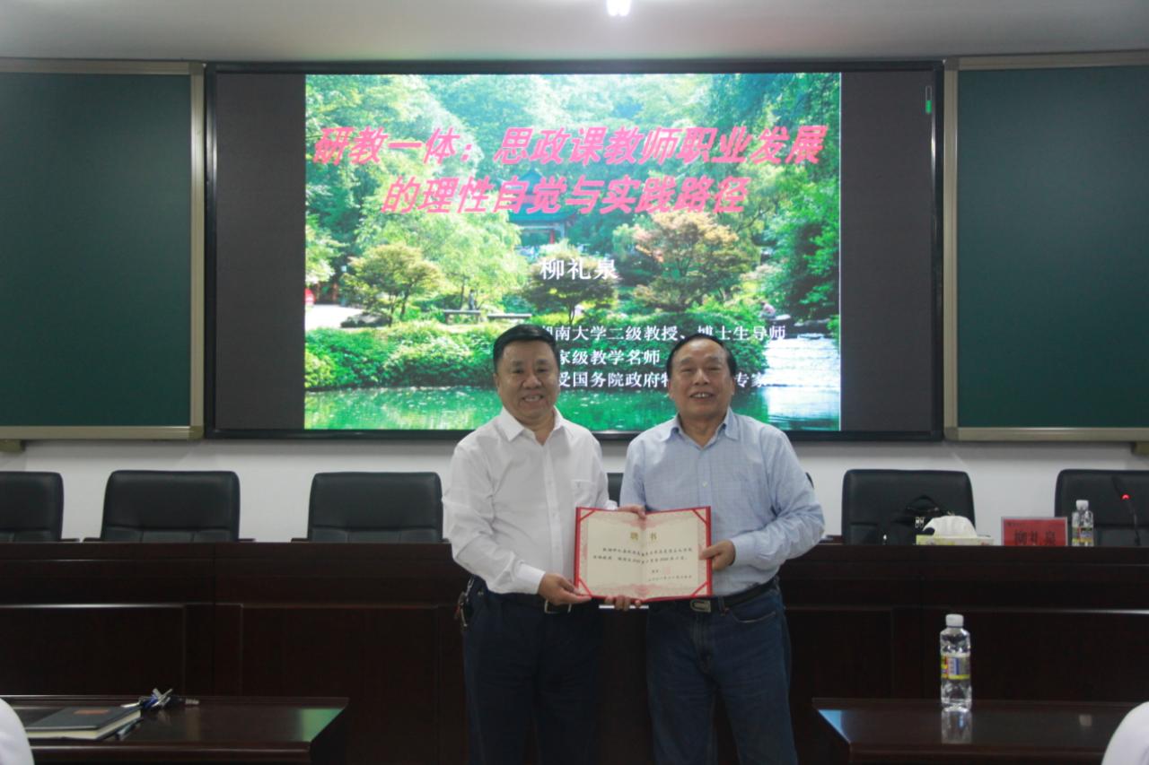11月19日晚上,湖南大学教授、博士生导师、国家级教学名师柳礼泉在社科楼A309为sunbet申搏官方网站师生作了关于“研教一体:思政课教师职业发展的理性自觉与实践路径”的学术报告。sunbet申搏官方网站院长张云阁教授主持报告会,并为柳礼泉教授颁发sunbet申搏官方网站“特聘教授”证书。